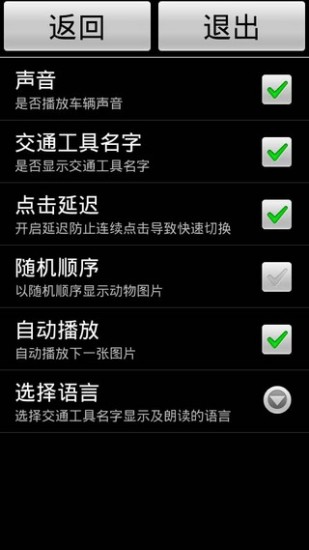 内置19种交通工具高清图片以及其名称的中英文显示,并配有对应的交通工具特有的声音,其名称有中英文双语可选播报。适合婴幼儿学习认识各种交通工具,适合低年级小朋友学习交通工具中英文表达。包括的交通有:飞机,救护车,热气球,自行车,公交车,小汽车,马车,消防车,直升机,摩托车,警车,轮船,地铁,坦克,出租车,拖拉机,火车,电车,卡车。...