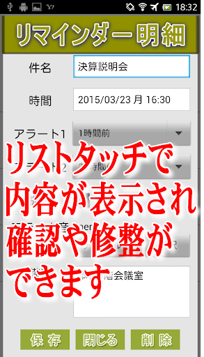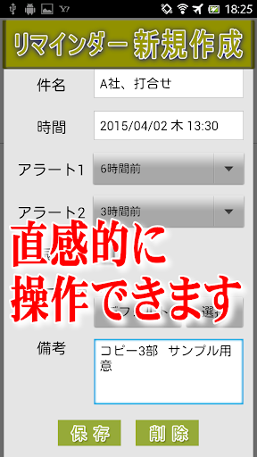 直感的に使いやすく 【件名・日時・アラート日時・備考】 を入力します。