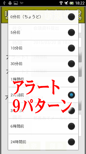 アラートは、ちょうど・5分前~24時間前の9パターンを用意。