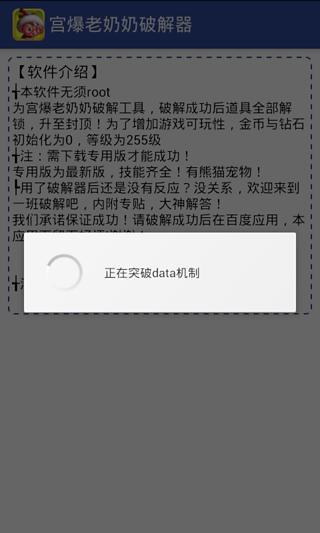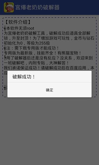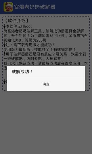 此软件为宫爆老奶奶破解器,可支持破解人物技能,自动升至满级,玩转宫爆老奶奶,此破解器,不同与其它破解器的是,它不需要root权限,操作也十分简单,只需打开此软件,软件自动开始运行破解步骤,提示破解成功后,进入游戏,你就可以发现,你的等级为255极限等级!游戏已经成功激活为完整版啦!技能都满到爆了!宠物是不是也会跟在你屁股后面放放大招?技能是不是有点变态…... 展开
