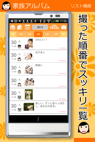 このアプリは、家族の写真が簡単に撮れて、大切なアルバムを眺めるように、