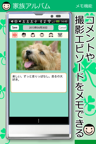 共有機能を使えば、一緒に写っている家族へメール添付して送ったり、SNSに投稿することも簡単にできます。また、写真やコメントはSDカードにバックアップすることもできるので、機種変更しても大切なアルバムを引き続き使うことができます。