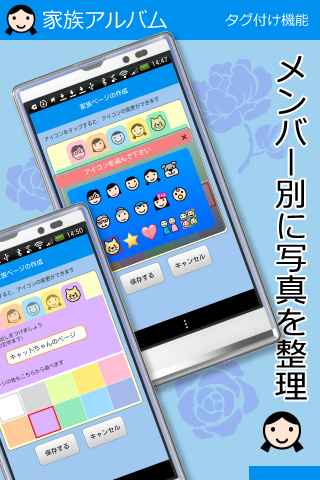 写真ごとにアイコン(タグ)を付けて整理ができます。アイコンは全部で15種類(お父さん・お母さん・お兄ちゃん・お姉ちゃん・おじいちゃん・おばあちゃん・ボク・ワタシ・赤ちゃん・ワンちゃん・ネコちゃん・スター・ハート・カップル・グループ)。その中から5つを選べます。アルバム表示では、アイコンのタブ(インデックスラベル)を切り替えて、「お父さんのページ」「お母さんのページ」などメンバーごとの写真ページを開いて見ることができます。テーマカラー(背景色)も10色の中から選ぶことができます。