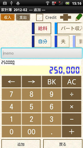5.収支入力画面へ移動します。ここで、計算機のACボタンを押し、「追加」ボタンで保存すれば、データ削除できます。