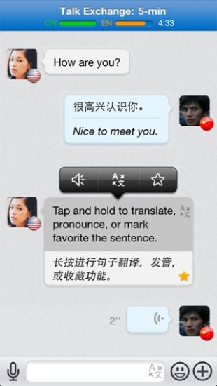 HelloTalk - 全世界第一款 外语学习/语言交换 语音社交应用 * 在你所在城市或全世界找到语言学习伙伴 * 透过文字和语音方式的语言交换,和语言学习伙伴互相帮助,共同学习外国语 * 给他们发照片,和他们分享你的爱好、宠物、你喜欢的食物、你的生活等 最好的外语学习方法,就是直接和外国人对话。如果你在学习英语,最好是能找到母语是英语,但同时在学习中文的朋友。HelloTalk 是为了协助你找到语言学习伙伴而诞生的、全世界第一款语言学习社交应用。 HelloTalk 有独特的语音和文字语言交换模式: * 先说5分钟中文 (帮助你的伙伴学中文),再说5分钟英语 (你的伙伴帮助你) * 用中文和英语分别交流500个字或字母 * HelloTalk 自动计算每个语言的时间或字数,确保公平和愉快的语言交换 语言学习爱好者,还在等什么呢? 赶快去和全世界的语言学习伙伴打招呼吧!