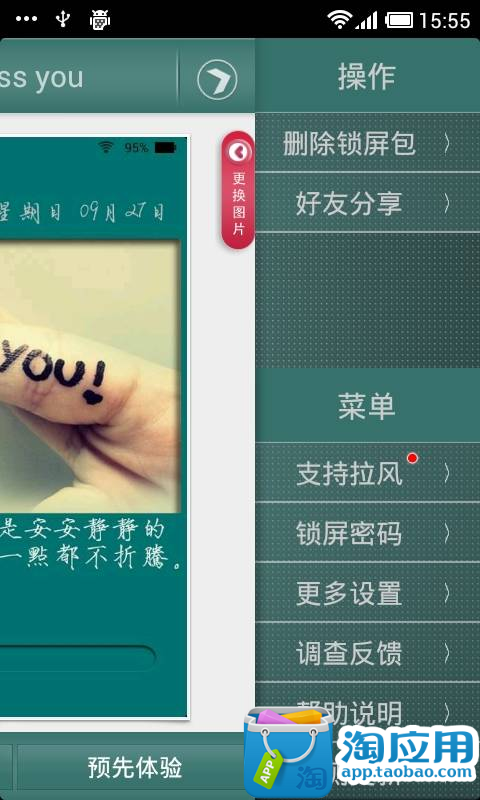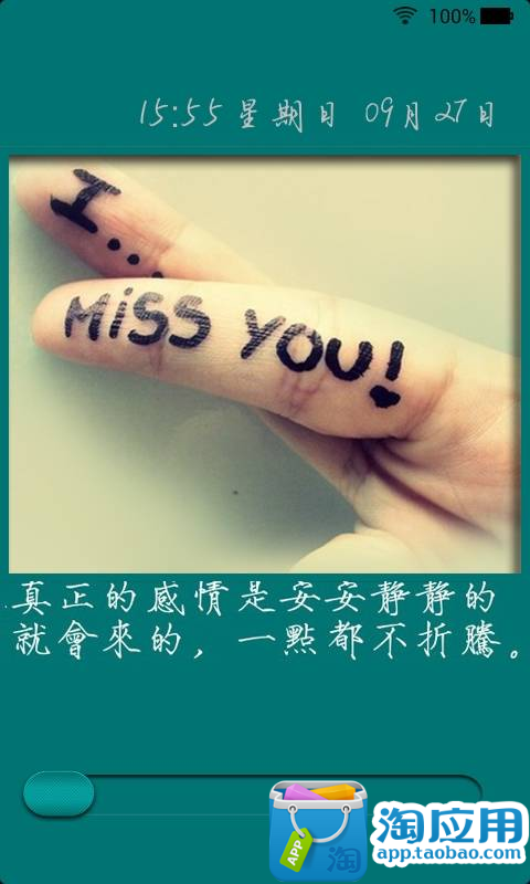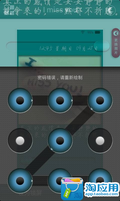 真真正正的感情是安安静静的。此款锁屏全球首发,滑块右移即可解锁,还可以更换背景哦!纯手工编译,让你的锁屏更加独树一帜!还包含了密码和九宫格锁屏,令你的爱机更加私密,空白处上滑播放器就出来了,网络端每天都有新鲜出炉的锁屏在等着你,这么多丰富多彩的功能你还hold住吗,赶快来体验一下吧!