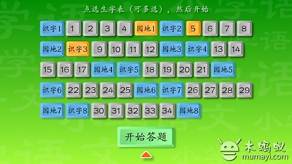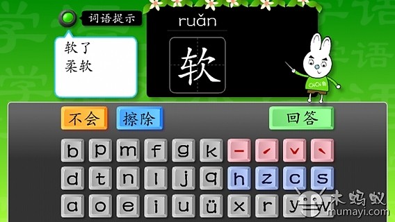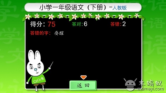 小学一年级语文下册拼音识字学习课件-人教版(人民教育出版社出版)(生字表1 的550个会认会读的生字学习)● 可在开始前,单选或多选需要练习的课程生字(2次选择可取消选择).例如:可选“课文3”+“课文9”+“课文10”,进行3课一次练习.● 开始练习后的生字顺序为随机打乱出现,每次出现顺序不同.● 学习过程:孩子只需要(按实际书写拼音的顺序)点选课件中相应的字母单元,生字上方会出现相应的拼音,然后点选声调,检查无误后,点击“回答”,答对出现“√”,答错出现“X”(答错后会出现正确的拼音);如果点选字母后,检查发现错误,可以点击“擦除”,进行重新点选字母;如果出现的生字不会,可以直接点击“不会”,上方会出现正确的拼音.● 可以点选“词语提示”显示或隐藏词语提示,对学习进行相应辅助.● 选择练习课的生字全部出完后,点击“得分”,会出现本次练习的得分,答对的字数,答错的字数,答错的字有哪些字.● 点击“返回”到开始界面,可以进行下一次的学习.
