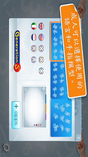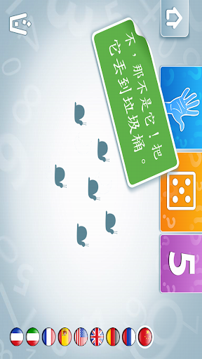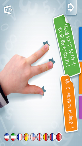 - 通過點擊螢幕右側的標誌,你可以聽到九種語言中的數位:英語、德語、美語、中文、西班牙文、法語、義大利文、荷蘭文、俄語。一個獨特的機會,使你的孩子從小就認識到外國語言的聲音特性 !你們可以一起分辨這些不同語言中的異同。