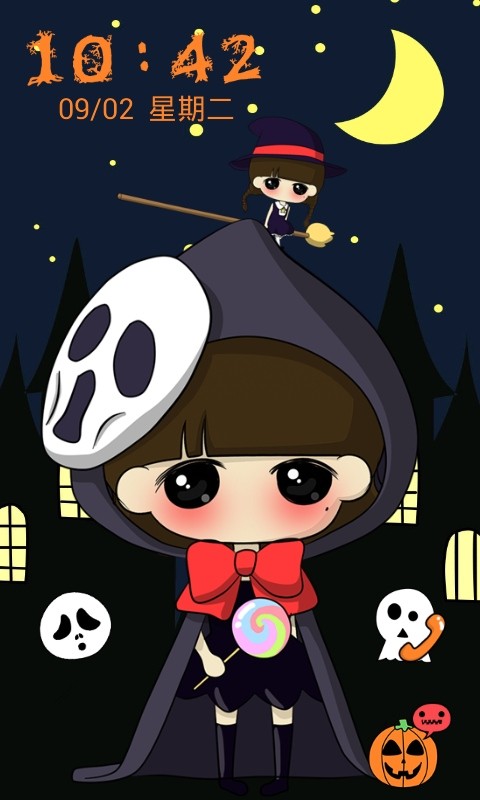 下方的南瓜和右边的幽灵分别是短信和电话,滑向棒棒糖就能进入电话和短信。