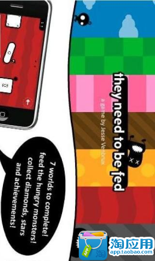 They Need To Be Fed(小怪兽求包养)是一款安卓平台上趣味的休闲游戏,要求玩家在各种不同色彩的世界中,去帮助那些正在饿着肚子的小东西。不同的大关卡中将会有一种颜色作为整个关卡的主色调,其余剩下的将会是黑与白两种颜色,结合2D的表现方式,让游戏显得简洁而明快。看着自己控制的小精灵,不断的在各个方块、球体以及平台之间跳来跳去获得钻石,最后送去给需要钻石的小东西!