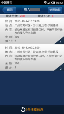 2.交通违法信息:包含车辆违章时间、地点、类别、罚款扣分、处理地址等