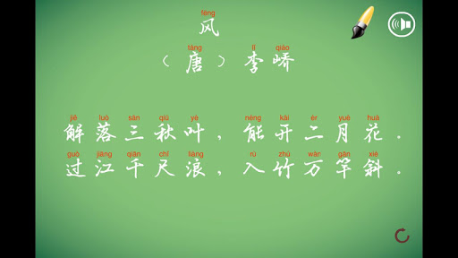 点击毛笔工具,可以对诗歌中的每一个字进行书写练习,在书字画面中点击左右按钮就可以切换生字。让孩子学习写字。