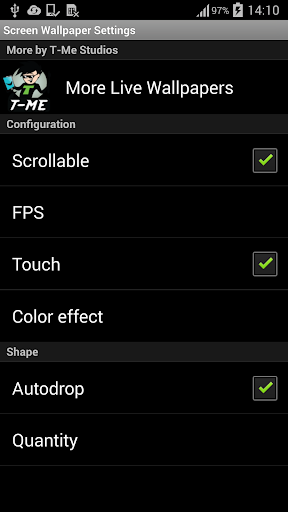 Poți mări dimensiunea, viteza, sau densitatea elementelor. De asemenea poți selecta trei efecte diferite de culori și trei intensități de culore. Pentru a-l customiza, deschide aplicația, click pe "Setare Live Wallpaper" iar apoi click pe "Setări".