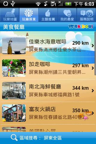 只要用屏東版阿貴KiDoWi就可以讓您輕鬆瀏覽屏東的美食餐廳、特色小吃、名勝古蹟、住宿購物資訊。除了自動定位功能,可以幫助您找出在您附近的景點外,在”玩樂屏東”單元還可利用區域搜尋功能,讓您快速找出分類中的屏東鄉鎮景點。