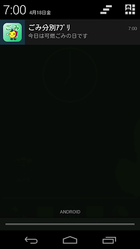 ごみの収集日をアラートでお知らせします。お知らせする時間はユーザーが自由に設定することができます。(前日夜に設定することも可能です)
