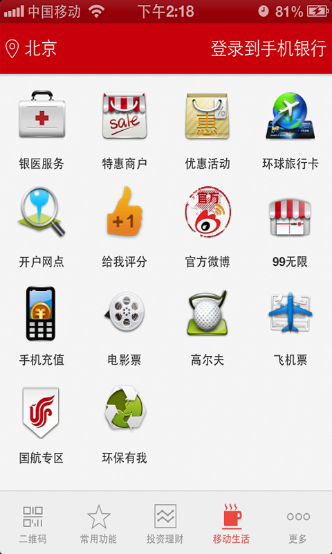 8、联系我行:您无需注册、登录手机银行,即可查询当前位置周边我行营业网点及ATM机等信息;还可通过便捷的电话方式、短信方式联系我行,了解我行更多金融服务。