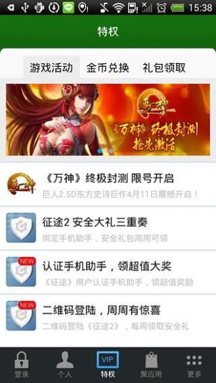 《巨人手机助手》(简称“GAMM”)是针对巨人游戏玩家的游戏助手,软件主要提供动态密保登录、二维码登录、账号管理、巨人点充值、用户特权、聚应用、活动通知等服务。手机助手,不止是安全!其主要功能包含:1、二维码登录二维码登录,是巨宝推出的更安全可靠、方便快捷的特色功能!免除输入帐号、密码、动态密保一系列繁杂操作,既方便,又能防止木马病毒窃取用户信息!2、手机密保60秒动态密保自动更新,绑定手机密保的账号,登录时需完成额外的动态密保验证为您的巨人通行证账号保驾护航!您可以使用“手机密保开关”,按需开启或关闭手机密保。3、特权手机助手用户专享服务,包含各个游戏的独有活动、礼包以及每日登录、分享,抽奖等内容,选择并坚持使用,可获得额外实物、巨人卡、游戏道具!4、聚应用汇聚并分享优质移动游戏!最全面最便捷的游戏插件中心!5、账号管理包含:帐号注册、添加/更换绑定手机、重置游戏密码、设定密保问题等功能