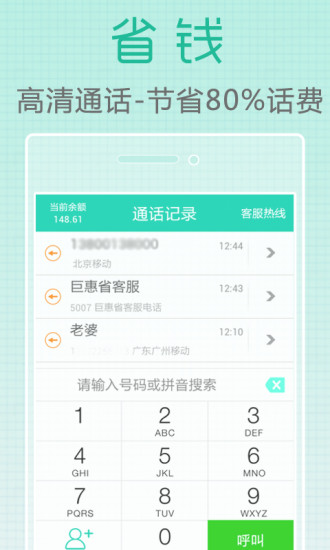 爱通话免费省钱网络电话,时下国内最受追捧的免费省钱通话软件。高清音质,轻松即拨,全国电话任您拨打,开通“去电显号”,真正全天24小时0资费,接通率100%,通话清晰,价格低廉!