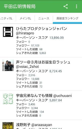クラスタ内を盛り上げるためにツイートや話題を提供しているユーザーを、シェアされた回数や影響度に応じて、相対的に貢献度をランキングします。ランキングは数時間ごとに更新されます。