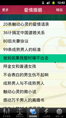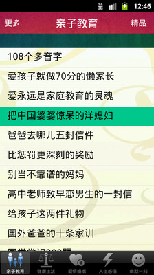 本应用将互联网上网友经常分享的极有参考价值的820篇文章,分成五大栏目整理,分别是“亲子教育”,“健康生活”,“爱情婚姻”,“人生感悟”与“幽默一刻”。通过该应用,您可以随时随地通过手机离线阅读这些好文章,从而不断提高经营家庭的能力。“家和万事兴”,家庭和睦了,事业自然会更成功。祝您阅读愉快,好运连连!