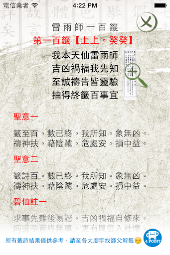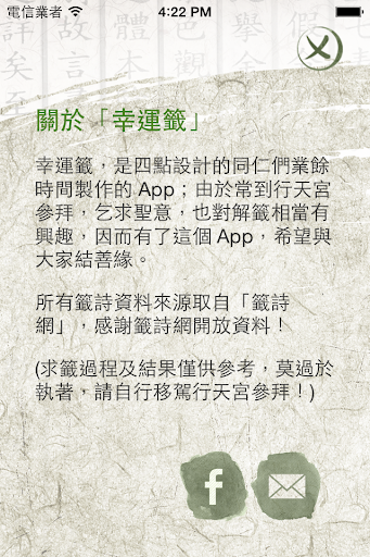 幸運籤,是四點設計的同仁們業餘時間製作的 App;由於常到行天宮參拜,乞求聖意,也對解籤相當有興趣,因而有了這個 App,希望與大家結善緣。