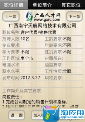 广西人才网( www.gxrc.com )是广西壮族自治区人力资源和社会保障厅(原广西壮族自治区人事厅)、中国广西人才市场创办的大型人力资源专业网站,为企业及个人提供网络招聘、网络广告、网上人才交流会、网上人才信息查询、网上求职等多项服务,网站信息量大,服务范围覆盖全区,同时辐射华南、西南地区,是目前广西拥有最大人才数据库、最多招聘职位数、最高访问量、最广覆盖面和最完善的服务体系的专业人力资源网站。 自 2003 年11月正式开通以来,广西人才网得到了广大求职者和用人单位的大力支持,发展迅勐。截至2010年元月,广西人才网每天页面访问量达100万次,每天在线招聘的企业超过2000家,每天在线的招聘的职位超过2.5万个,每天在线的求职人才达5万人次,累计为近4万家企业和140万人才提供招聘、求职服务,是广西最有影响力的人力资源网站,为广西人才服务业发展和广西经济发展做出了重大贡献。 感谢各位用户对广西人才网一贯的支持,欢迎广大用人单位进入中国广西人才市场、广西人才网招贤纳才,祝愿广大求职者通过中国广西人才市场、广西人才网( www.gxrc.com )谋得一份理想工作。 本软件只是个人作品,所有数据均来自广西人才网( www.gxrc.com )。