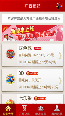 广西彩票客户端由广西福彩官方授权的专业手机彩票投注软件,旨在为广西移动彩民提供可视化界面的投注服务,实现话费快捷买彩票。主要彩种为:双色球、3D、七乐彩、快乐十分、快乐双彩! 应用特色 客户端投注+短信投注(无网络时选择短信投注)、单式+复式投注、单倍+多倍投注、机选(摇一摇就可以机选)+自选投注、追号、查询购买记录、中奖纪录查询等。