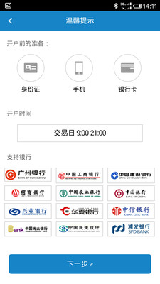 广州证券官方手机自助开转户软件,手机开户,足不出户,十分钟极速开户,帐户下一交易日内即可生效。最新版本支持功能有:1、新开上海A股帐户;2、新开深圳A股帐户;3、新开上海基金;4、新开深圳基金;5、上海A股转户;6、深圳A股转户、7、上海基金转户、8、深圳基金转户、9、创业板转户。支持的三方存管银行有:工商银行、建设银行、农业银行、中国银行、招商银行、民生银行、浦发银行、光大银行、中信银行、华夏银行、兴业银行、广州银行、上海银行。