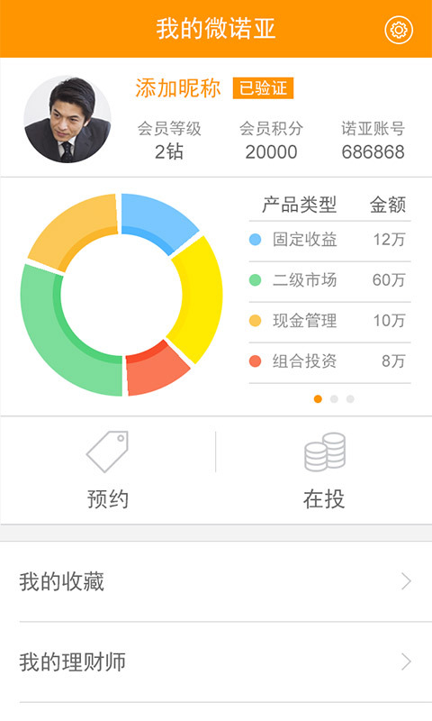 诺亚财富(NOAHWealthManagement)品牌起源于2003年,专注于为中国高净值人士提供全方位的私人财富管理服务,2010年11月10日在纽约证券交易所上市(交易代码:NOAH),目前已成为中国大陆最大的独立财富管理机构。诺亚提供包括货币市场基金、债券投资基金、证券投资基金、信托、房地产基金、私募股权、基金中的基金(母基金)、另类投资(电影、艺术品等基金)在内的丰富投资产品选择。十年财富管理经验,千亿资产配置规模,诺亚财富已拥有50余家分公司,4万余名高净值客户,500余名理财师。诺亚财富,专属于高净值人群的资产配置专家。诺亚推出微诺亚手机版服务平台,汇聚众多实用功能,为中国高净值人士提供私密、专业、便捷、及时的服务,轻松尽享移动金融理财。内容介绍:1、资产配置:金融产品资产配置一目了然,定期产品信息披露,项目投资追踪及运作表现,及时的产品收益分配与清算信息公布。2、产品精选:精选产品及时预约。会员可通过微诺亚预约浮动收益、固定收益、现金管理等各种安全性、收益性、流动性的综合金融投资产品。3、积分等级:及时了解在诺亚会员积分值及会员级别归属。4、金融资讯:诺亚深度研究报告与金融市场的及时解读,内容覆盖宏观经济、证券市场、房地产投资、PE/VC、信托市场、资产配置等,全方位把握金融市场动态。