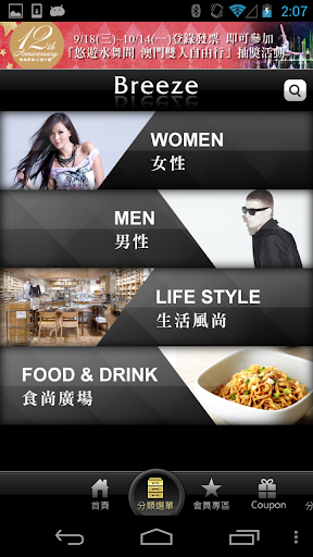 「分類選單」包含女性、男性、生活風尚、食尚廣場各種商品訊息