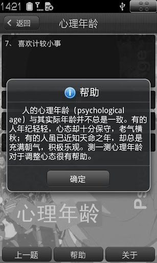 人的心理年龄(psychological age)与其实际年龄并不总是一致。有的人年纪轻轻,心态却十分保守,老气横秋;有的人虽已近知天命之年,却总是充满朝气,积极乐观。测一测心理年龄对于调整心态很有帮助。