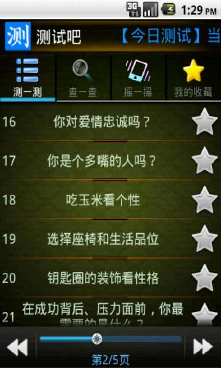 “测试吧”是一款趣味测试类软件,精选了当今流行的心理测试题,内容涵盖了人生的方方面面,包括性格、婚姻、爱情、职场、财富、社交、健康等,趣味盎然,仅供娱乐! 如果您觉得此软件还不错的话,记得推荐给好友使用哦!