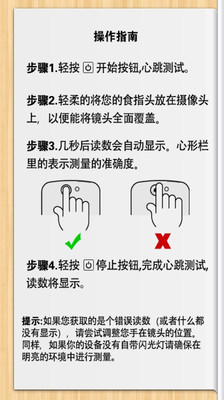 使用注意点:手指必须同时覆盖摄像头和闪光灯,否则无法读取心跳。