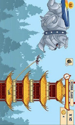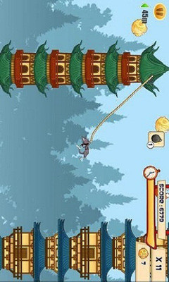 汤姆,一只来自家族的忍者猫,帮助它在塔群之间用绳索跳跃前进,摆脱Ratza家族的追杀,也许你会问古汤姆为什么会被追杀,其实也不是什么大事,就是古汤姆曾经偷了Ratza家族一本古老的卷轴。游戏操作很简单,就像之前的蜘蛛侠游戏一样,点击屏幕扔出绳索,再次点击屏幕隔断绳索跳跃,再次点击宝塔扔出绳索,就这样一步一步的前进,坠落到地上游戏就结束了。