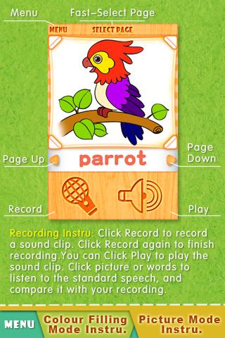 这是一款有趣的卡通填色的程序,你可以通过快速选取颜色来给原本空白的区域填上颜色,也可以调整色彩的透明度,通过多次填充实现你想要的任何色彩。填色完成后的图你可以选择保存,它将会在特有的图卡模式下显示出来,图卡模式我们设置了画面中物体的音效和英语的标准的发音,如果你有兴趣学习英语的发音,可以使用画面下方的录音按钮录制你的发音,这样就可以通过播放键和标准发音进行对比学习了。当然,如果你喜欢学习里面动物或者其他物体的声音,当然也可以试一试,或许你可以成为一个口技表演者。