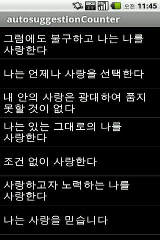 積極思考,積極的自我暗示的力量改變生活。每天幾十遍,請聽自己積極的話。直接輸入文本,也可以從列表中選擇的建議。選定的短語記當你閱讀看到並得到計數。全算,今天的數字存儲進行。當反复在我心中是沒有義務,作為一個愉快和放鬆你的頭腦。當水在花心中,自然引起了積極的生活,相信種子。