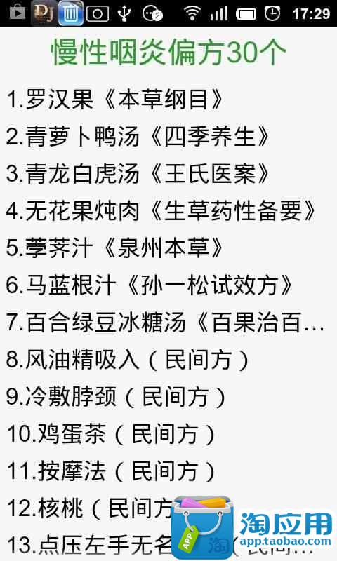慢性咽炎是咽部粘膜的慢性炎症,临床上相当多见,主要表现为咽部疼痛、干燥、发痒及异物感,或发声低微、声嘶沙哑等,当感冒发热、进食辛辣、休息不好,熬夜时症状加重,并可多年不愈。中医认为,慢性咽炎系风热喉痹反复发作,阴津暗耗、虚火上炎,熏灼咽部,或肺阴不足等所致。本程序收集了慢性咽炎偏方30个,送给需要的朋友!