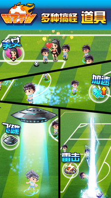 玩家在游戏中无需操作球员角色,只需使用道具阻止对方或本方进球即可,简单易上手,趣味横生!道具种类丰富,炸弹、美女、飞机、盾牌、堡垒、大炮、UPO、红牌……等等24种五花八门、各显神通的道具。