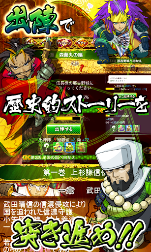 武将、武士、侍、忍者、100人以上の多種多様な武将を集め、戦を勝ち抜きライバルの野望を打ち砕け!