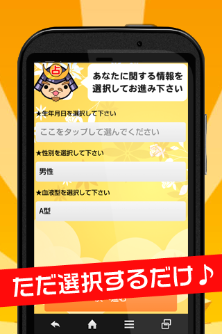 スタートボタンを押して生年月日と性別、血液型を選択するだけ!