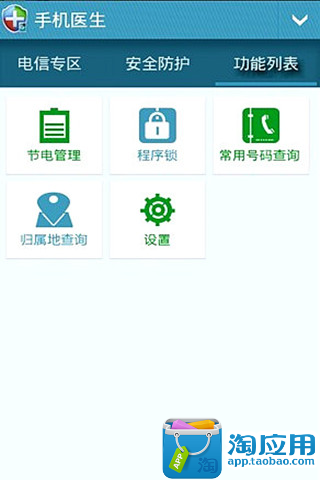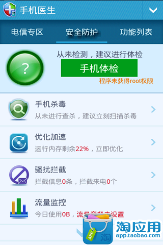 手机医生是中国电信推出的一款集手机性能优化和安全杀毒等功能为一体的手机安全产品,beta版本包含的功能有:手机体检,手机杀毒,优化加速,骚扰拦截,流量监控,节电管理,软件管理,电信专区,程序锁等基本功能.手机医生安全新体验,让您的手机生活更自在更健康!