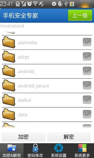 手机安全专家是一款免费的智能手机安全软件,为您提供广告查杀,权限扫描,文件加密,软件加密等实用功能.主要功能:1,广告查杀:敏感权限检测,恶意广告扫描和查杀,防止恶意软件后台下载.2,文件加密:可以对txt,word,图片等任何文件加密.3,程序保护:可以对短信,相片查看程序等任何软件进行加密.提示:如果您在使用过程中有什么问题,请点击反馈按钮给我们意见或者建议.