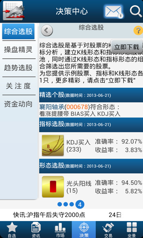 手机证券是最安全流畅的免费手机炒股软件,行情数据准确快速是您投资理财,选股必备的最佳选择.提供沪深AB,中小板块,创业板,基金,港股,全球指数等实时股票行情和专业的个股K线,报价,盘口,明细,技术指标,Level-2数据,资金流向,精品资讯,行业深度数据等综合信息,帮您实时监控主力资金动向,全面分析股票动态.软件特色:1.倾入专业数据分析,人工提炼要点资讯2.资金流向排行,精选潜力金股3.界面美观,数据清晰直观4.全球重要指数动态播报 5.K线形态组合选股,特色指标分析6.实时在线交易,支持70余家券商新版本特性:1.优化系统提示文字,让用户方便易懂2.优化系统界面,让用户得到更好的帮助