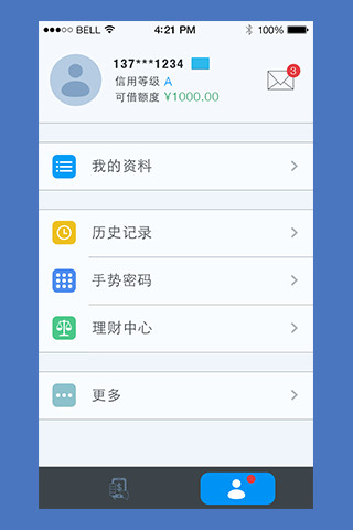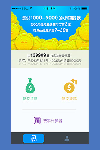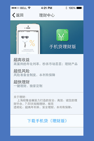 手机贷中国人的信用钱包。 国内首款小额投资理财与信用借贷款P2P平台客户端。提供30天内、5000额度以内的借贷款和理财服务;即刻满足资金需求,随时随地都能借贷! 手机贷是诚策金融用创新的无线互联网技术和专业风险控制理念建立了一个安全、高效、诚信的网络平台,改进了原始民间借贷存在的弊端,规范了个人借贷行为,让借款人和出借人均得到高效的诚信服务。