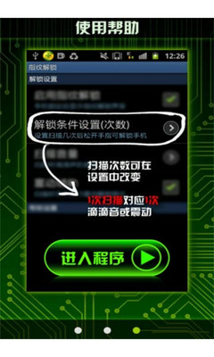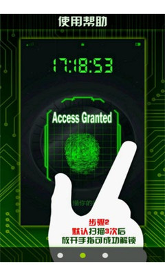 扫描指纹解锁是一款娱乐软件,将带给您一种超酷的解锁体验。软件通过用户指纹式样的扫描来解锁手机(由于当前手机硬件限制,无法真正识别用户指纹)。扫描次数对应滴滴音或手机震动,具体成功次数用户可以自行设置,扫描次数错误会出现"授权失败"字样,无法进入软件解锁,当扫描次数和用户设定次数一致才能正常解锁。