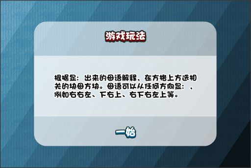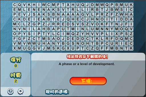 在这个含有丰富教育意义的文字游戏里测试您的英语水平和词汇吧!您的目标是根据显示出来的词语解释,把词语在方格上找出来。游戏里会有一个由许多字母方块组成的大方框,而隐藏词语的解释则会于方框下方显示。词语可以从任何方向显示,例如由右至左、由下至上、由右下至左上等。当您找到词语后,您可在方框上点击和拖曳滑鼠,以圈出相关的字母。您现时的选择会在画面底部显示出来。若您成功找出正确答案,就可因应您所用的时间获得分数。每一个错误的答案都会令您失去1000分,所以务必小心行动。若您未能根据解释想出词语,您可点击在解释下方的看提示按钮取得答案,但每次如此做您都会被扣减3000分。您所用的时间以及目前的得分会在画面左下方显示。与家人和朋友一起玩,看看谁是真正的词汇大师!