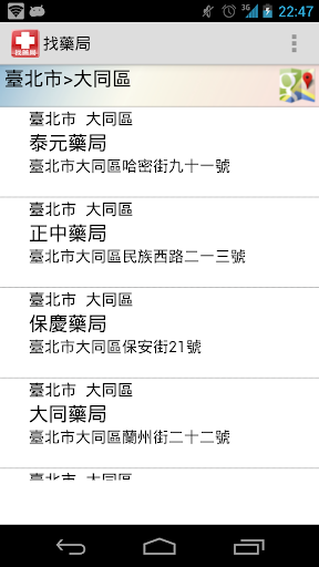 人難免有病痛,如果不想去醫院診所,該怎麼知道哪裡有距離最近的藥局呢?「找藥局」就是一款方便又實用的APP,只要選擇你的所在縣市,「找藥局」就會列出該縣市的行政區或鄉鎮,使用者再選取所在地,「找藥局」就會條列出該區所有之藥局資訊。