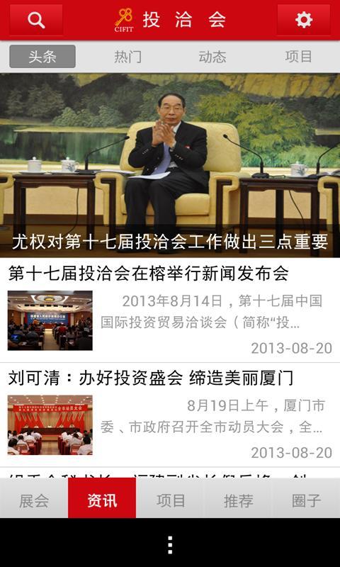 为满足客商的移动商务需求,随时随地查询投洽会的各种实时动态资讯,组委会隆重推出“移动投洽会客户端”,该客户端设有展会、资讯、项目、推荐、圈子五大模块,集合了网上投洽会全部内容,展示投融资领域信息,提供交互功能,平台与用户及时共享和开放。