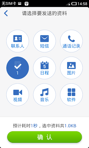 目前手机常用的九大类型资料都可以轻松转移:通讯录,软件,短信,通话记录,书签,图片,音乐,视频,日程。