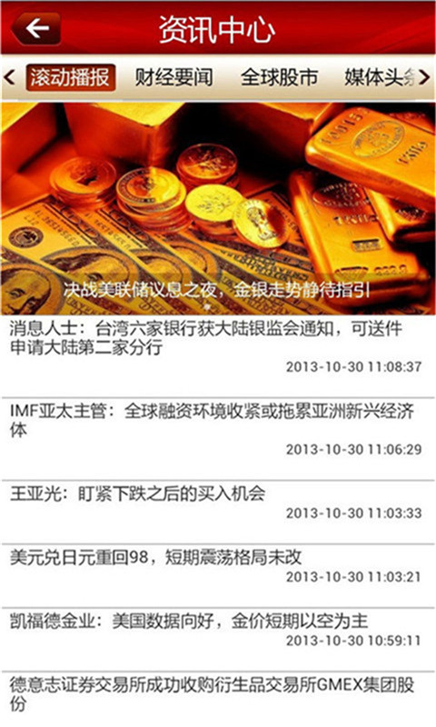 掌上贵金属官方版软件是一款在Android手机上查看国内,国际财经新闻,有要闻速递、财经要闻、经济指标、全球股市、各国央行、汇市评论、黄金评论、原油评论、财经头条、深度报道等,同时还提供全球股指、上海黄金、现货黄金、外汇行情等实时行情数据,同时抱括外汇、股指、上海黄金交易所的实物黄金(AU9999/AU9995)、延期交割(AUTD/AGTD)品种、天通银粤贵银即时行情的软件。